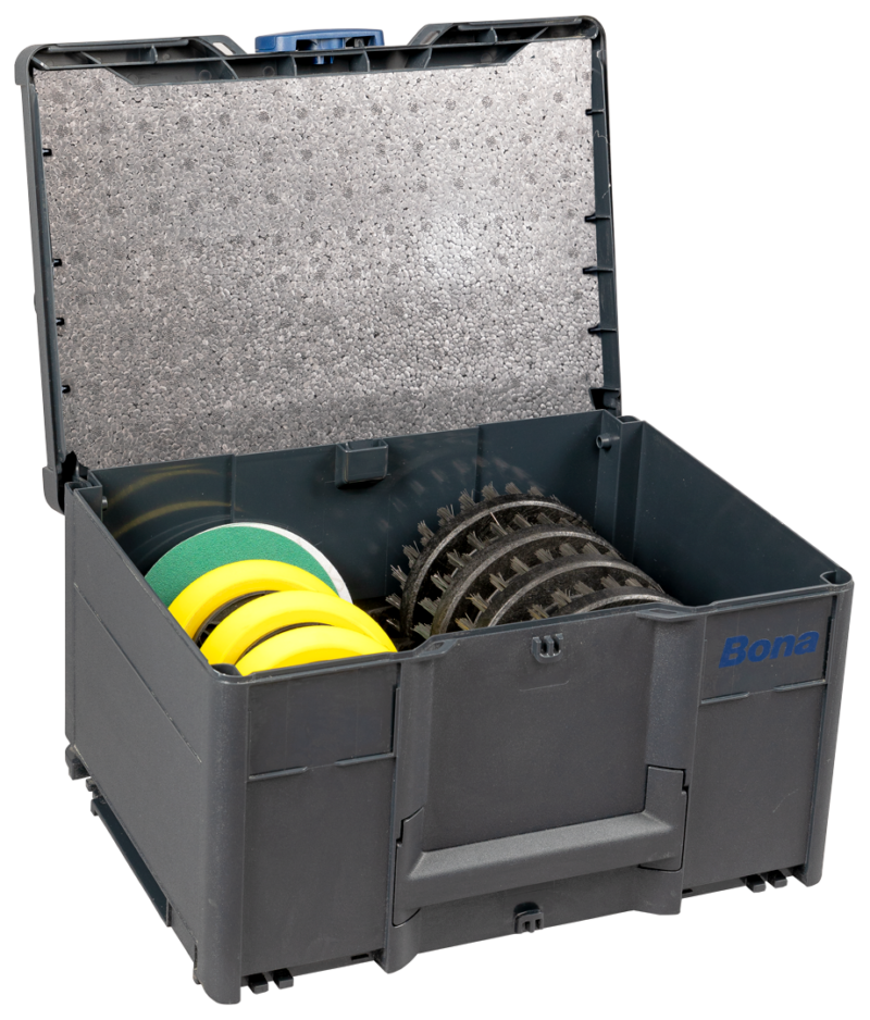 Zložljive škatle, ki jih je mogoče zakleniti med seboj. Vsaka škatla ima vložek, posebej zasnovan za najboljšo zaščito vaših orodij. Povezuje se z Bona Box Trolley za enostaven in gladek transport.