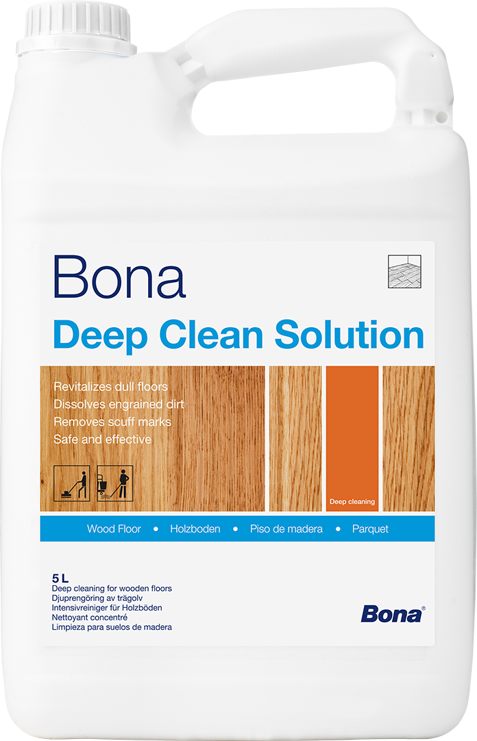 Bona Deep Clean Solution je vsestransko močno čistilo za lesene in elastične talne obloge. Odlično je za občasno globinsko čiščenje in kot razmaščevalec pred ponovnim premazovanjem. Na prostem je prav tako odlično za letno čiščenje lesenih teras. Formulirano za visoko učinkovitost brez kompromisov glede varnosti. V kombinaciji z Bona PowerScrubberjem ustvari škripajoče čisto površino, optimalno pripravljeno za nanos vzdrževalnih izdelkov ali za ponovno premazovanje z Bona lakom. Tudi primerno za ročno čiščenje.