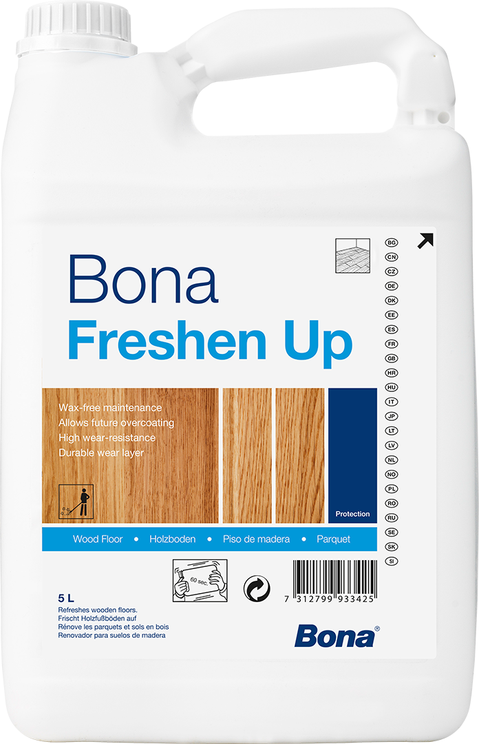 Bona Freshen Up je pripravljena za uporabo vzdrževalna premaz za periodično vzdrževanje in zaščito lakiranih lesenih tal. Popolnoma temelji na poliuretanski disperziji, ustvarja vzdržljivo obrabno plast, pripravljeno za obremenitev s peš prometom tako v domačih kot komercialnih prostorih. Ustvari visok sijaj, ki daje nov lesk dolgočasnim tlom. Formuliran brez dodatka voskov, kar omogoča premazovanje s profesionalnim lakom, če je potrebno.