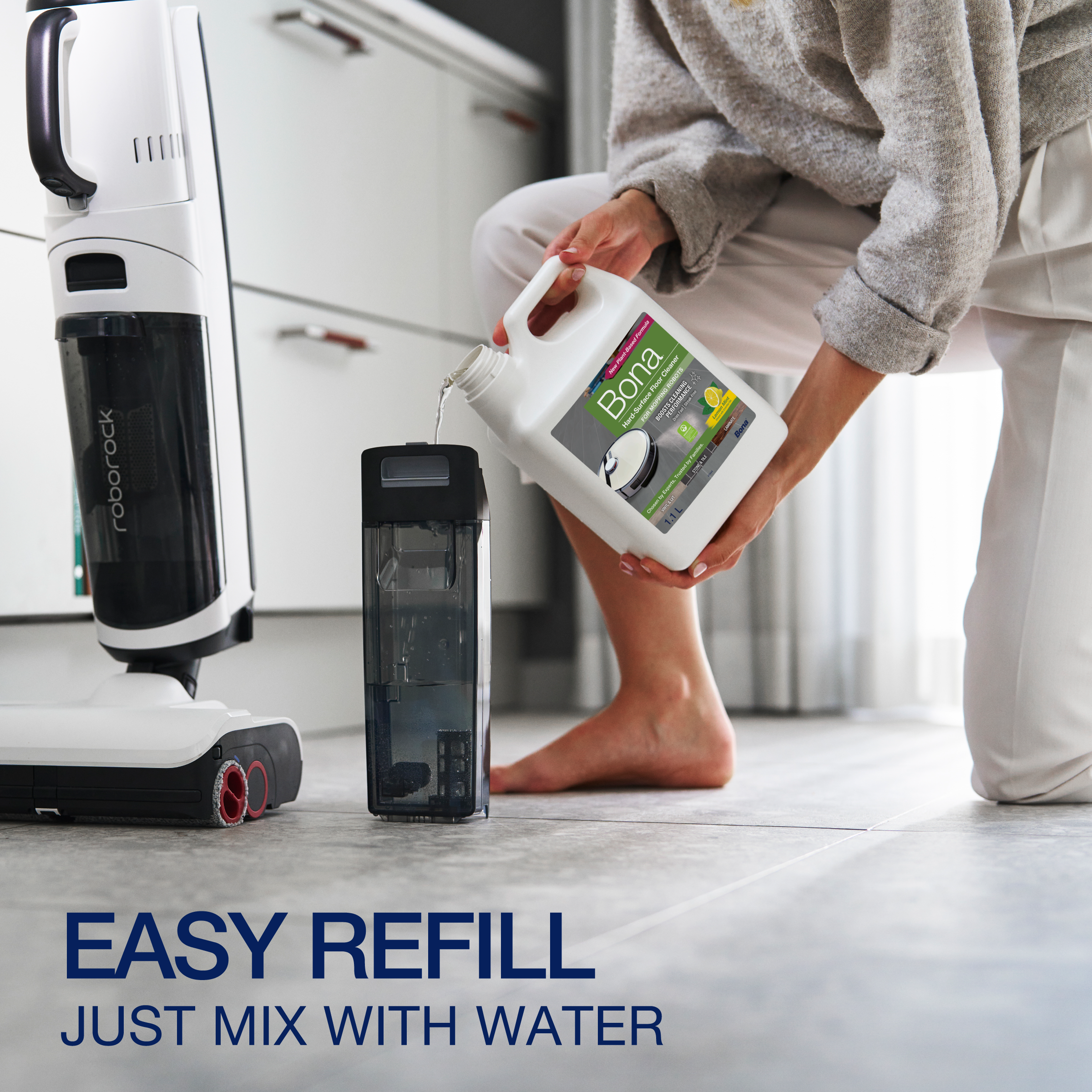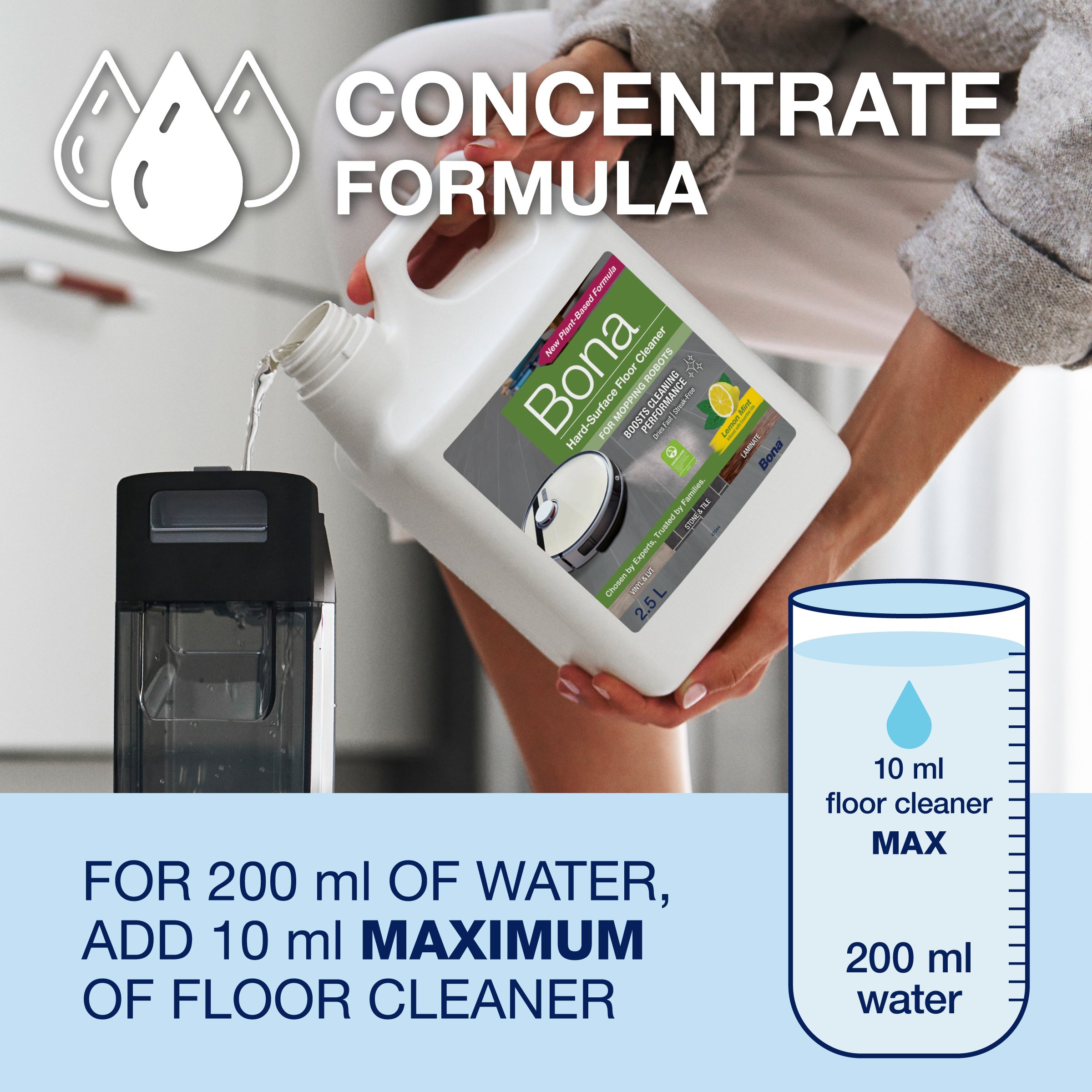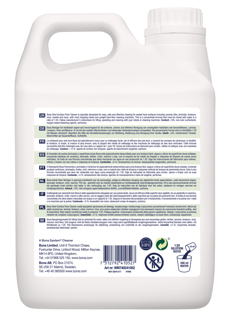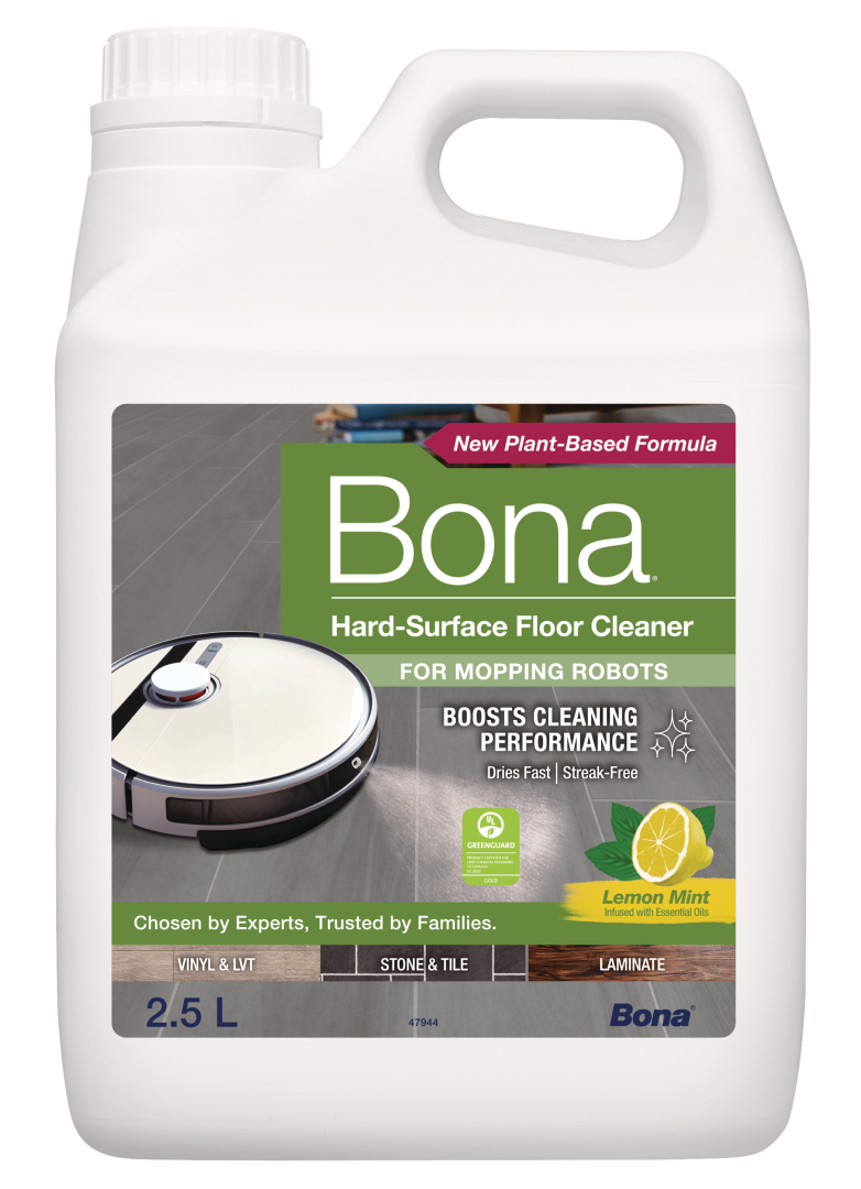 Talni izvajalci se strinjajo, ko iščete najboljše za nego trdih talnih oblog, uporabite Bona. Bona Hard-Površina Floor Cleaner je zdaj na voljo v posebej formulirani raztopini, zasnovani za uporabo z večino robotov za mokro čiščenje in pokončnih sesalnikov za mokro čiščenje za izboljšanje učinkovitosti čiščenja. Ta edinstvena koncentrirana formula z bio-osnovanimi sestavinami je posebej razvita za enostavno, varno in učinkovito čiščenje zatesnjenih trdih površin, vključno s keramičnimi ploščicami, laminatom, linolejem, vinilom, marmorjem in drugimi, da vaša tla ostanejo čista in lepa. Posebej zasnovana formula brez izpiranja, brez lis, s svežim vonjem limonine mete, ki učinkovito čisti trde talne obloge z odstranjevanjem prahu, umazanije in madežev. Vodna, pH uravnotežena formula se hitro suši in je tudi certificirana z GREENGUARD GOLD, kar podpira boljšo kakovost zraka v zaprtih prostorih.