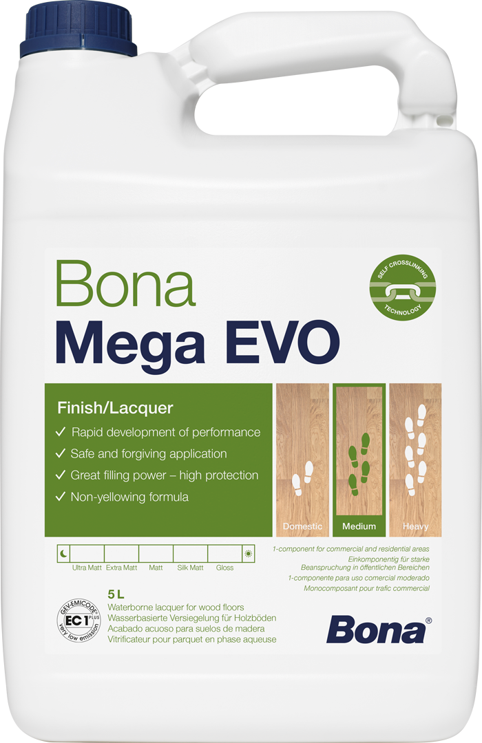 Primeren za komercialne prostore, kot so pisarne, majhne trgovine, hotelske sobe, in kot vrhunska izbira za domove. Edinstvena formula omogoča hitro sušenje z odlično odpornostjo proti praskam, obrabi in kemikalijam. Bona Mega EVO ima gladko konsistenco, ki ponuja izjemne lastnosti polnjenja in izravnave. Edinstvena tehnologija samopovezovanja omogoča hitro vrnitev na tla in kratke čakalne dobe med nanosi.