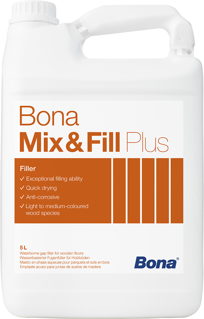 Bona Mix & Fill Plus je vodno vezivo za učinkovito zapolnjevanje rež in votlin v lesenih tleh. V večini primerov je en nanos dovolj za zapolnitev rež na novo položenih tleh. Priporočljivo je za svetle do srednje obarvane vrste lesa, kot so oak, beech, pine in maple. Bona Mix & Fill Plus je pogojno primerno za reže do 3 mm širine.