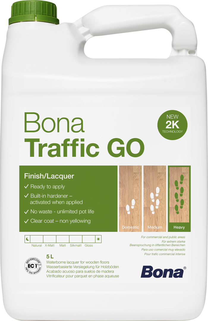 Z novo generacijo 2K tehnologije utrjevanja Bona Traffic GO združuje enostavnost in učinkovitost 1K laka z vzdržljivostjo in zmogljivostjo pravega 2K izdelka. Inovativni Bona Traffic GO z vgrajenim trdilcem je pripravljen za uporabo neposredno iz pločevinke in zagotavlja varnejšo aplikacijo, ki presega zahteve prihodnosti, hkrati pa dosega visoke ravni vzdržljivosti. Čeprav je Bona Traffic GO dovolj vsestranski za uporabo tako v komercialnih kot domačih prostorih, je še posebej primeren za lokacije z veliko peš prometa.