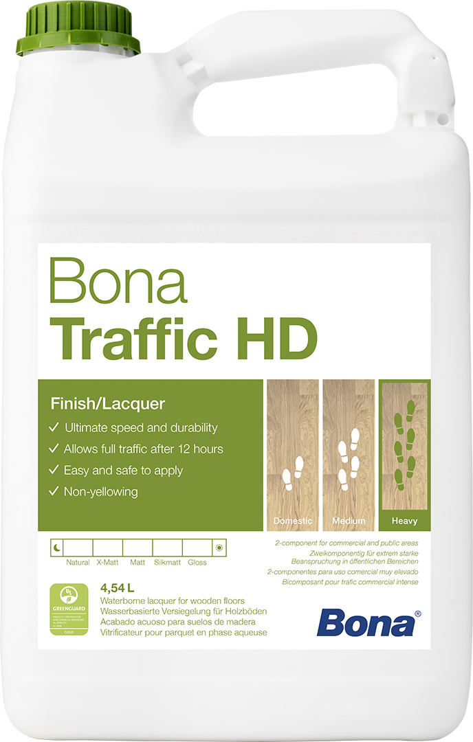Bona Traffic HD je najmočnejši in najhitreje sušeči lak na svetu. Omogoča, da se polna uporaba nadaljuje že 12 ur po nanosu, in je bil razvit za nanos na velike površine. Uporablja se v hotelih, restavracijah in letališčih po vsem svetu, kjer je kratek čas nedelovanja bistven, je lak za lesena tla, ki je izpopolnjen.
