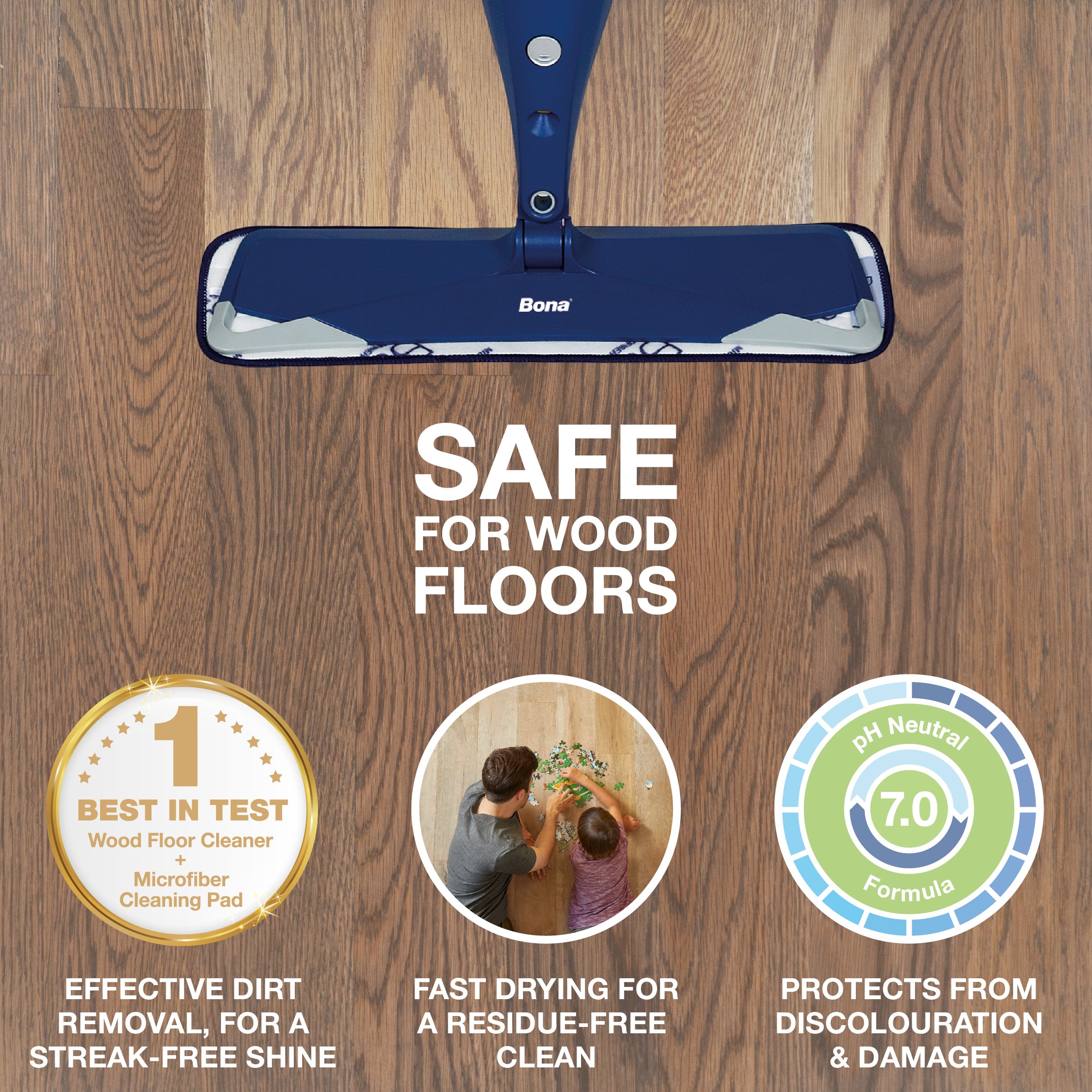 Ko iščete najboljši način za nego lesenih tal, mnogi izvajalci talnih oblog priporočajo uporabo Bona Wood Floor Cleaner. Rešitev brez ostankov, hitro sušeča in pH-nevtralna, čisti lesena tla z nežnim in učinkovitim odstranjevanjem prahu, umazanije in madežev, da razkrije naravni sijaj in lepoto tal. Varno za vse nevoskane poliuretansko zaključene lesene talne obloge. Vodna rešitev in certifikat GREENGUARD GOLD zagotavljata varen izdelek za vaša tla.