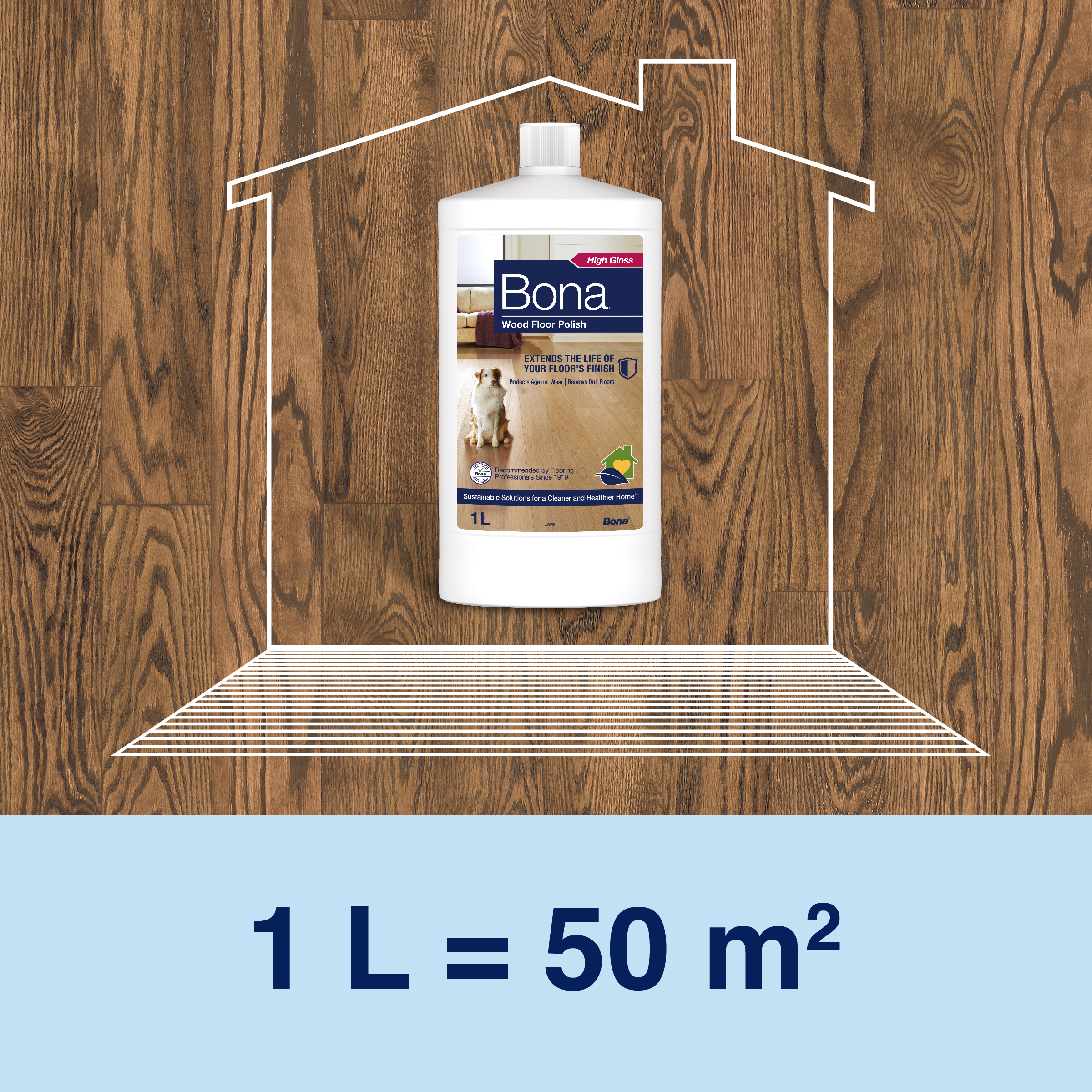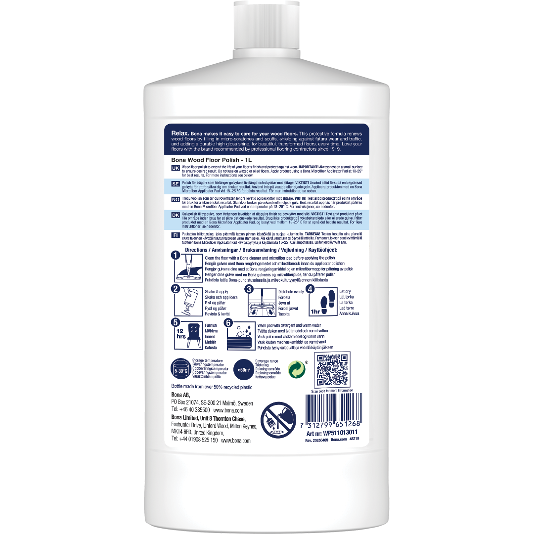 Bona Wood Floor Polish Sijaj obnovi sijaj vaših lesenih tal, hkrati pa nudi zaščito pred obrabo. Trajna mešanica uretanskega akrila doda zaščitni sloj z visokim sijajem in zapolni mikro praske, kar izboljša videz vaših tal. Uporabljajte vsakih 1-4 mesece, odvisno od prometa, da ohranite tla revitalizirana in kot nova. Pomembno! Pred uporabo vedno testirajte tla za oprijem in želene rezultate. Varno za vsa nevoskana, poliuretansko obdelana lesena tla. Ne uporabljajte na voskanih ali oljenih tleh.
