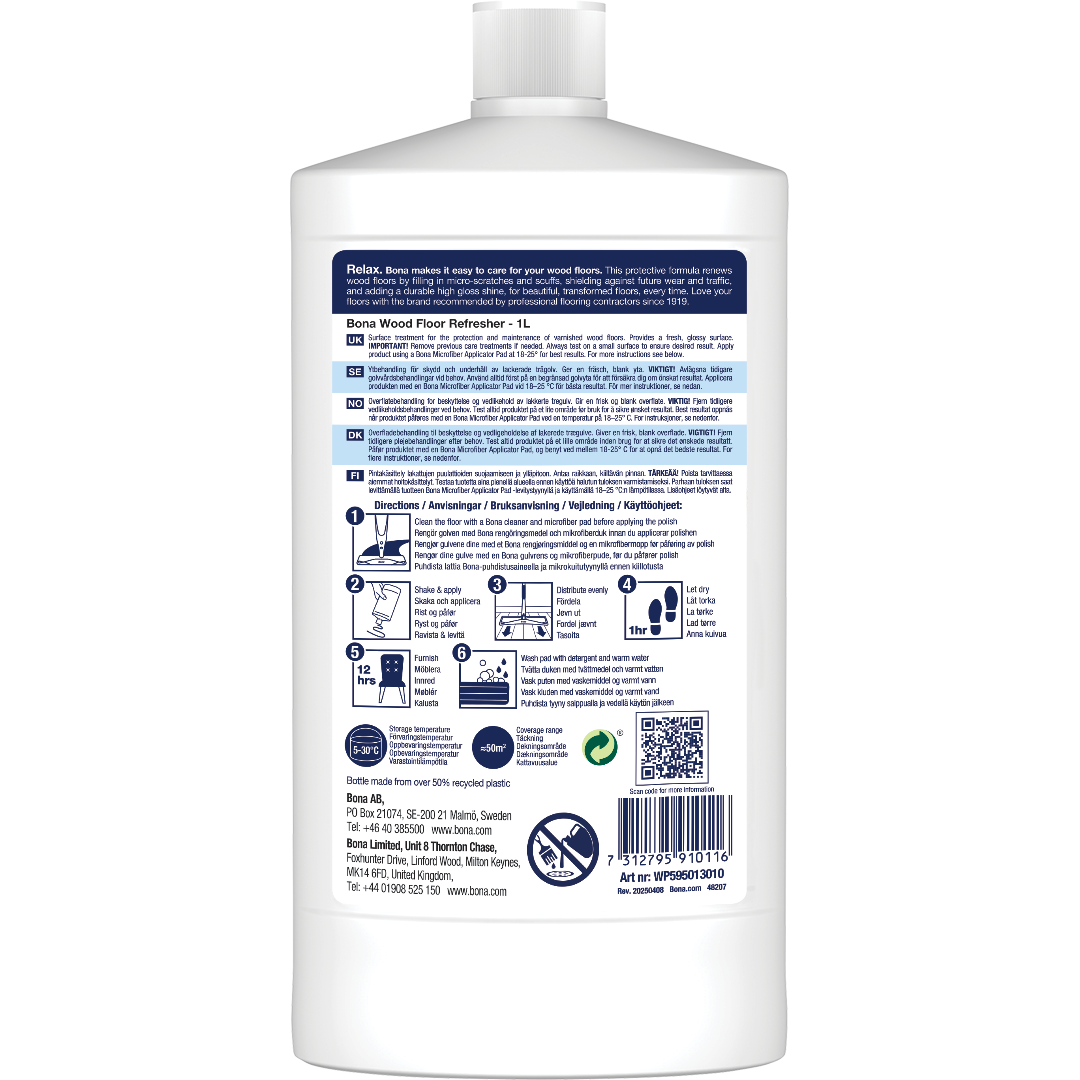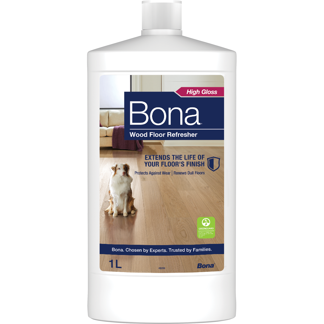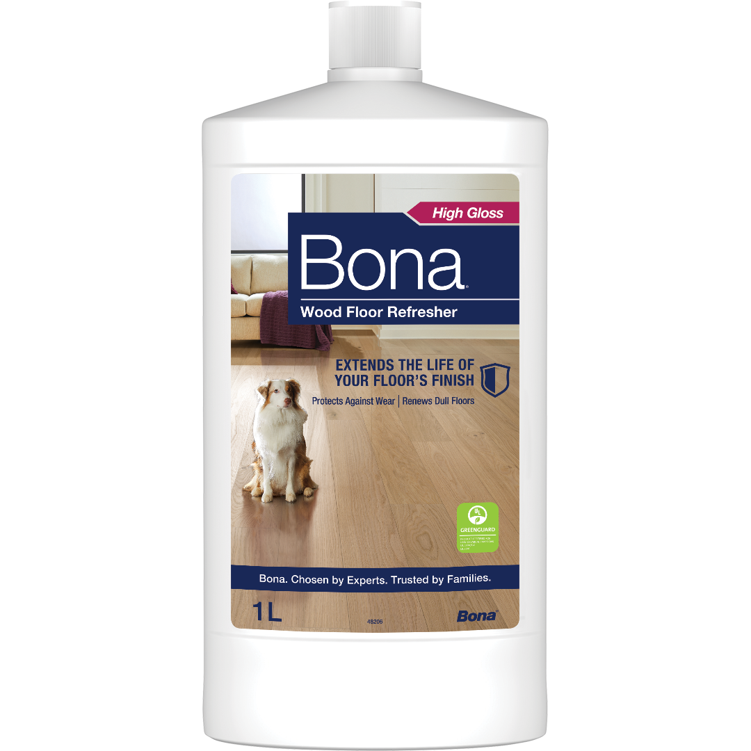 Bona Wood Floor Refresher obnavlja lepoto lesenih tal, povečuje sijaj in stara tla naredi kot nova. Formula na osnovi poliuretana zagotavlja odlično zaščito in ne vsebuje voska, kar pomeni, da omogoča prihodnje nanose premaza. Pomembno! Pred uporabo vedno testirajte tla za oprijem in želene rezultate. Ne uporabljajte na voskanih ali oljenih tleh.