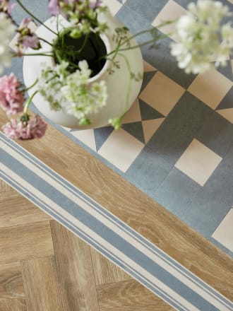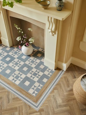 Umirjen pridih barve in hladna krema se združita, da ustvarita mehko, vabljivo posodobitev tega tradicionalnega dizajna ploščic.
