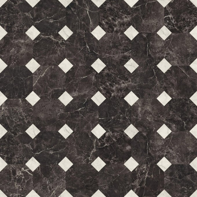 Blisk bele barve med poljem elegantnega črnega marmorja ustvarja močan videz, poln drame.