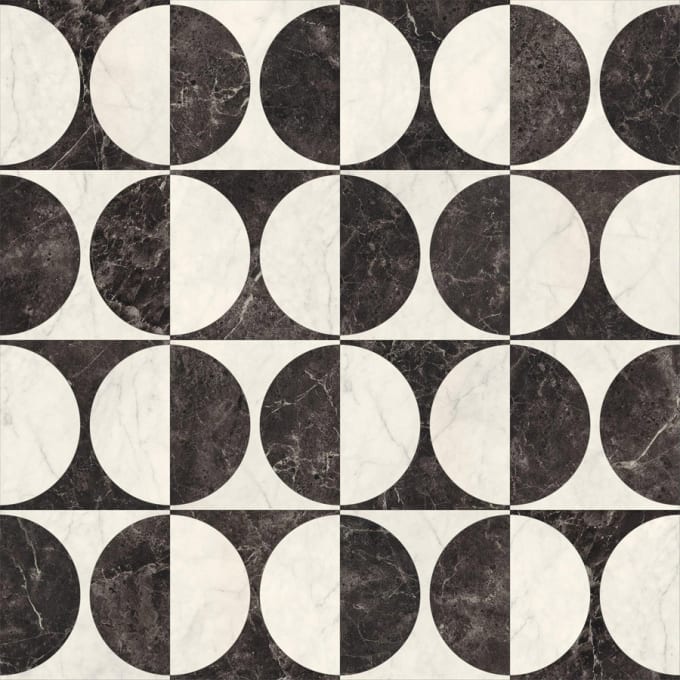 Klasična dvobarvna kombinacija v izrazitem vzorcu. Lune na prefinjen način označuje te klasične marmorje, za izrazito značilno območje z občutkom Art Deco.