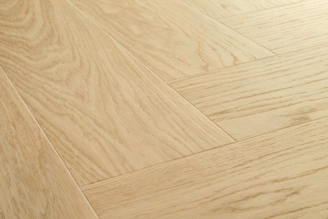 Ustvarjate vzorec ribje kosti? Običajno bi potrebovali dve različni vrsti desk, A in B, kar bi pomenilo počasnejšo in zahtevnejšo namestitev. Ne z Quick-Step talnimi oblogami v vzorcu ribje kosti. Naša talna obloga v vzorcu ribje kosti ima eno domiselno vrsto deske, ki se zaskoči na obeh straneh, zahvaljujoč sistemu Unizip. V kratkem času boste imeli čudovito novo talno oblogo v vzorcu ribje kosti!