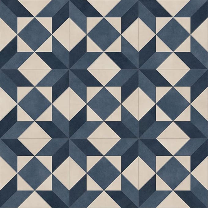 Visok kontrast kombinacije modrih tonov ustvarja izrazit dizajn, ki spominja na dekorativno keramiko.